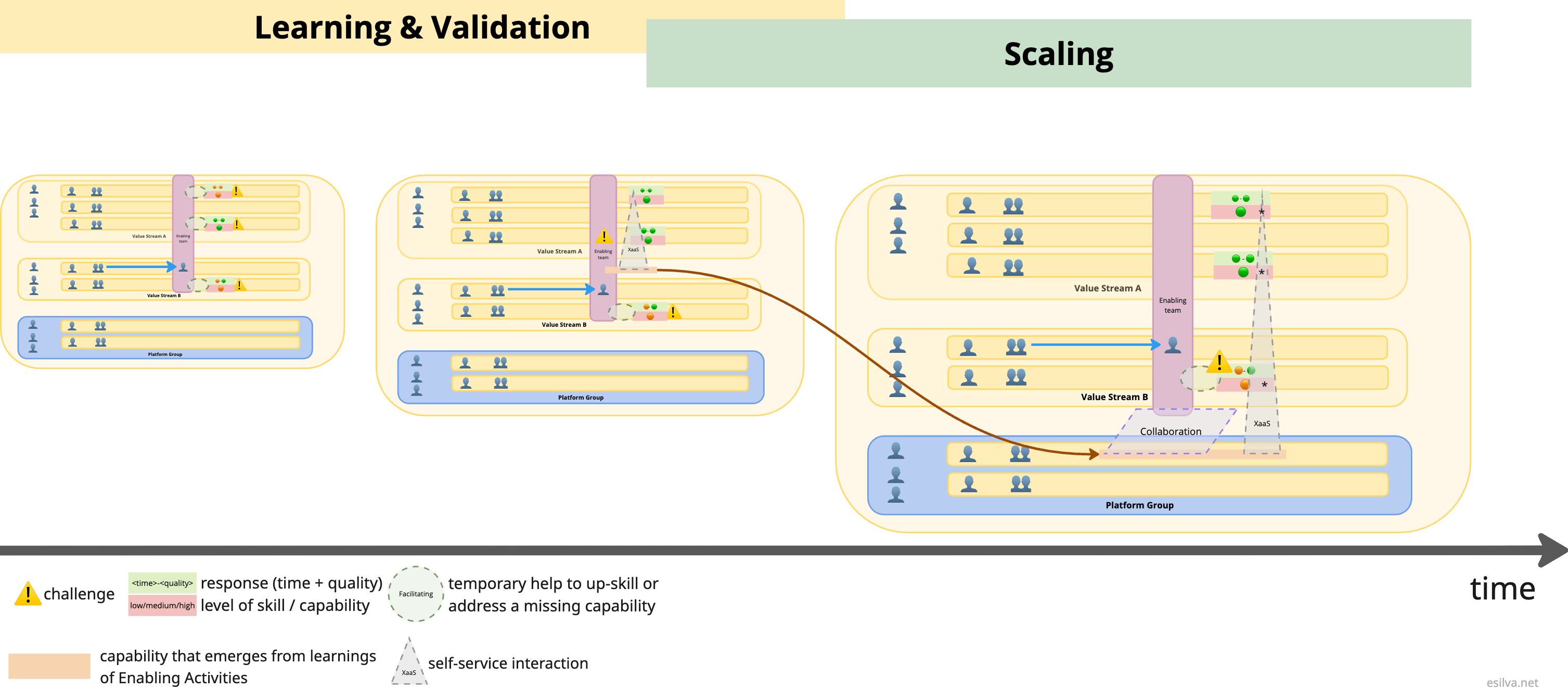 💡 Stretching Enabling Activities helps us assess the need for scaling: I want to reiterate that this phase, where we are reaching these limits or Enabling Activities, is not a bad thing. Sometimes I use the wording “do it until it starts to hurt”. The ida is to not optimize things before it actually is needed, i.e., understand we are probably reaching the limits, and we do not optimize prematurely. Organizations should not try to avoid this phase at all costs. I would even argue that these phases are very important as they allow us to shape emerging capabilities in organizations. We do that by working on the problems teams have and the expertise of the people driving and pioneering the necessary Enabling Activities to start curating these capabilities and the emerging components to support effective work on them. Making it a highly effective and strategic organization improvement pattern. In a nutshell, we are validating these emerging capabilities by addressing the problems faced by stream-aligned teams working on real business problems.
