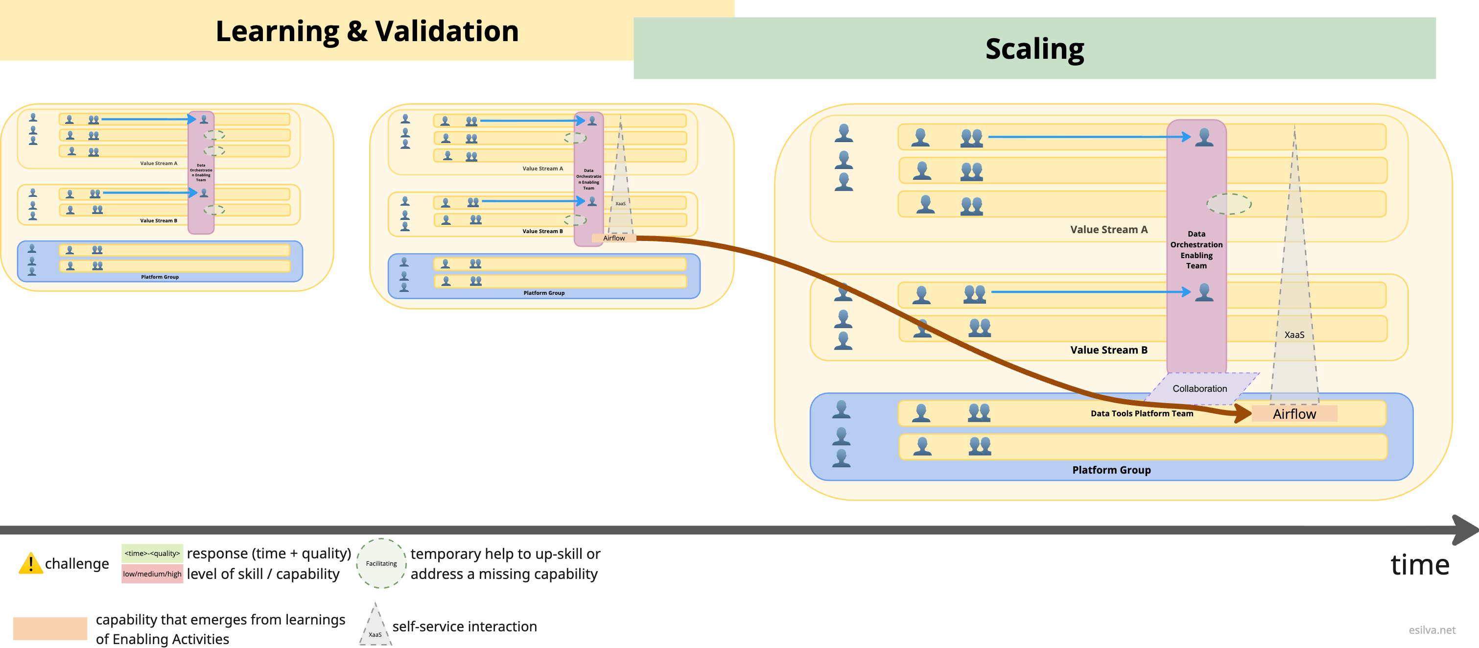 That transition effectively happened as a “collaboration” between the people performing Enabling Activities (and effectively leading the development of the Airflow custom solution) and people within the Data Platform who would become the new owners of that emerging capability component. The goal of the collaboration was simple: define how to better consolidate Airflow within the Data Platform, with high-quality support from a platform team that would continue to evolve and improve it. We can see this gradual evolution in the following diagram.